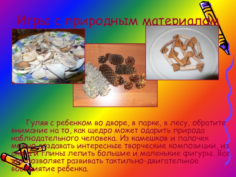 лесу, обратите внимание на то, как щедро может одарить природа наблюдательного человека. Из камешков и палочек можно создавать интересные творческие композиции, из снега и глины лепить большие и маленькие фигуры. Все это позволяет развивать тактильно-двигательное восприятие ребенка.