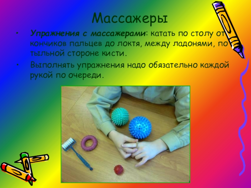 Упражнения с массажерами: катать по столу от кончиков пальцев до локтя,