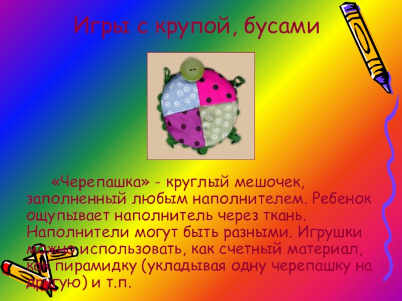 ощупывает наполнитель через ткань. Наполнители могут быть разными. Игрушки можно использовать, как счетный материал, как пирамидку (укладывая одну черепашку на другую) и т.п.