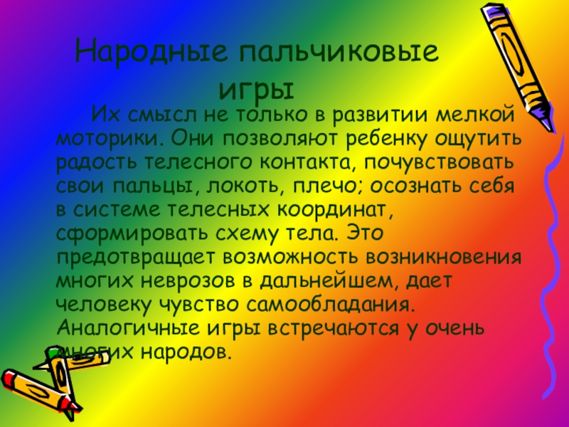 позволяют ребенку ощутить радость телесного контакта, почувствовать свои пальцы, локоть, плечо; осознать себя в системе телесных координат, сформировать схему тела. Это предотвращает возможность возникновения многих неврозов в дальнейшем, дает человеку чувство самообладания. Аналогичные игры встречаются у очень многих народов.