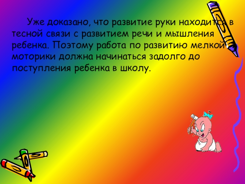 речи и мышления ребенка. Поэтому работа по развитию мелкой моторики должна начинаться задолго до поступления ребенка в школу.