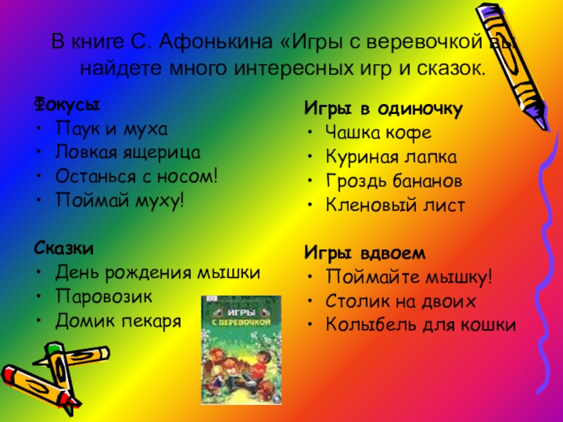 В книге С. Афонькина «Игры с веревочкой вы найдете много интересных игр и сказок.