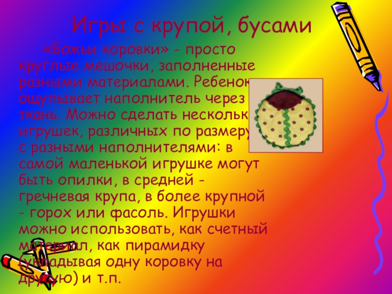 материалами. Ребенок ощупывает наполнитель через ткань. Можно сделать несколько игрушек, различных по размеру и с разными наполнителями: в самой маленькой игрушке могут быть опилки, в средней - гречневая крупа, в более крупной - горох или фасоль. Игрушки можно использовать, как счетный материал, как пирамидку (укладывая одну коровку на другую) и т.п.