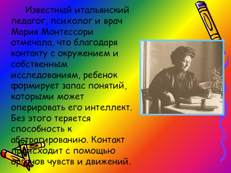 Слайд 3 Известный итальянский педагог, психолог и врач Мария Монтессори отмечала, что благодаря