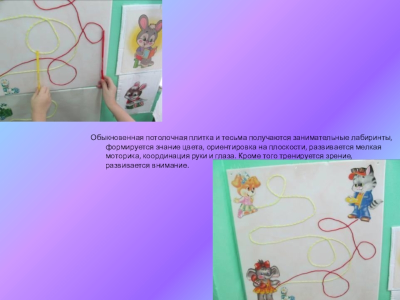 Слайд 11Обыкновенная потолочная плитка и тесьма получаются занимательные лабиринты, формируется знание цвета,