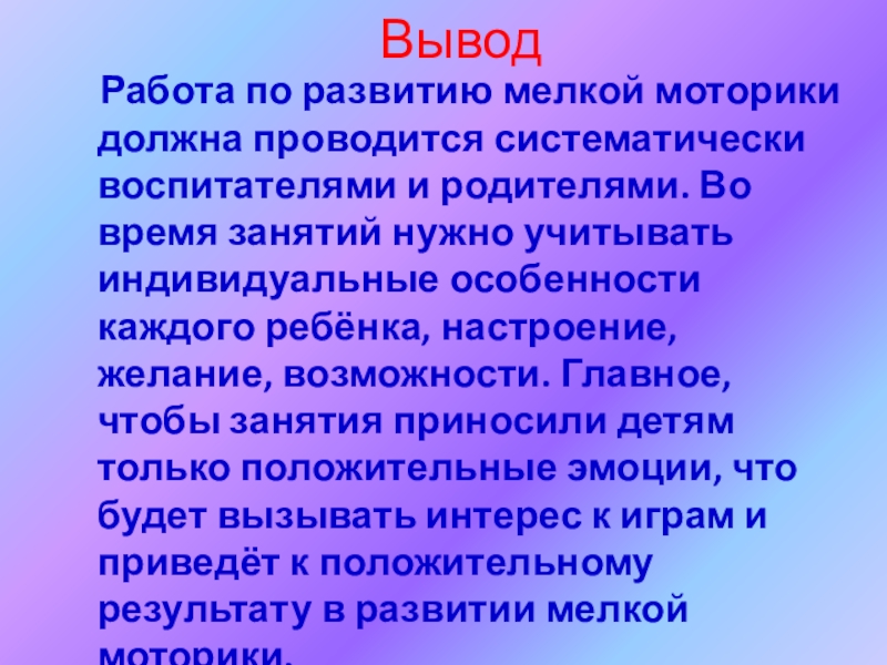 и родителями. Во время занятий нужно учитывать индивидуальные особенности каждого ребёнка, настроение, желание, возможности. Главное, чтобы занятия приносили детям только положительные эмоции, что будет вызывать интерес к играм и приведёт к положительному результату в развитии мелкой моторики.
