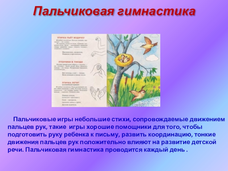 игры хорошие помощники для того, чтобы подготовить руку ребенка к письму, развить координацию, тонкие движения пальцев рук положительно влияют на развитие детской речи. Пальчиковая гимнастика проводится каждый день .