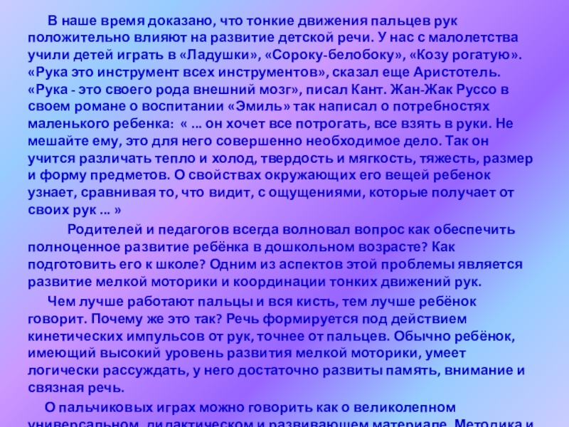 влияют на развитие детской речи. У нас с малолетства учили детей играть в «Ладушки», «Сороку-белобоку», «Козу рогатую». «Рука это инструмент всех инструментов», сказал еще Аристотель. «Рука - это своего рода внешний мозг», писал Кант. Жан-Жак Руссо в своем романе о воспитании «Эмиль» так написал о потребностях маленького ребенка: « ... он хочет все потрогать, все взять в руки. Не мешайте ему, это для него совершенно необходимое дело. Так он учится различать тепло и холод, твердость и мягкость, тяжесть, размер и форму предметов. О свойствах окружающих его вещей ребенок узнает, сравнивая то, что видит, с ощущениями, которые получает от своих рук ... »