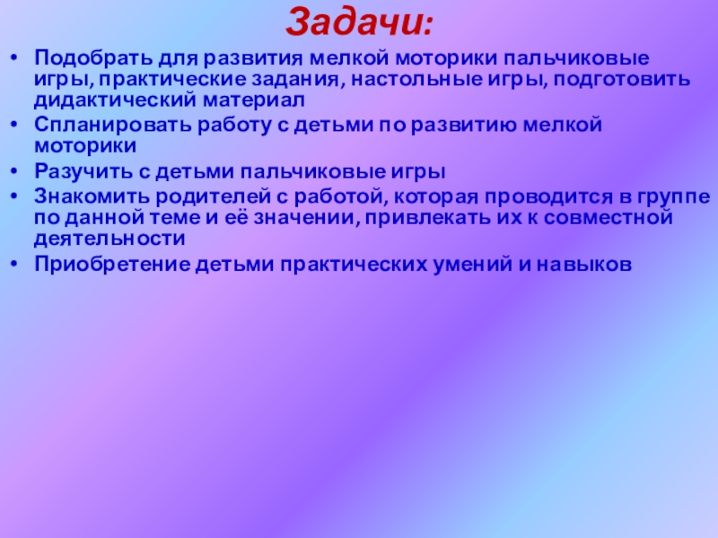 Подобрать для развития мелкой моторики пальчиковые игры, практические задания, настольные игры,