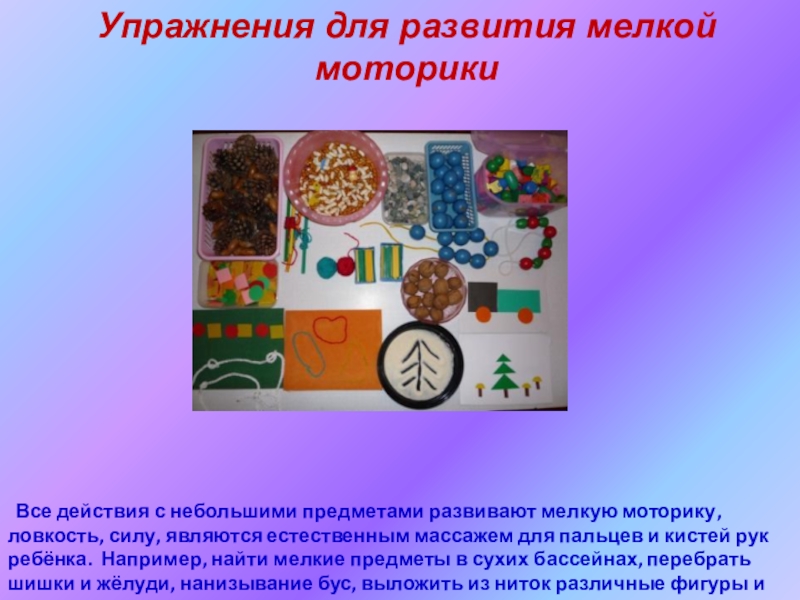 Слайд 10Все действия с небольшими предметами развивают мелкую моторику, ловкость, силу, являются