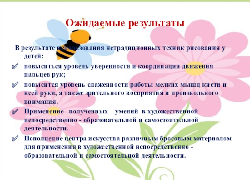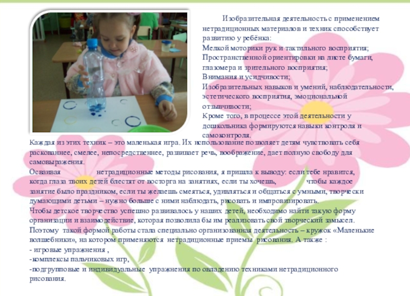 Слайд 18Изобразительная деятельность с применением нетрадиционных материалов и техник способствует развитию у
