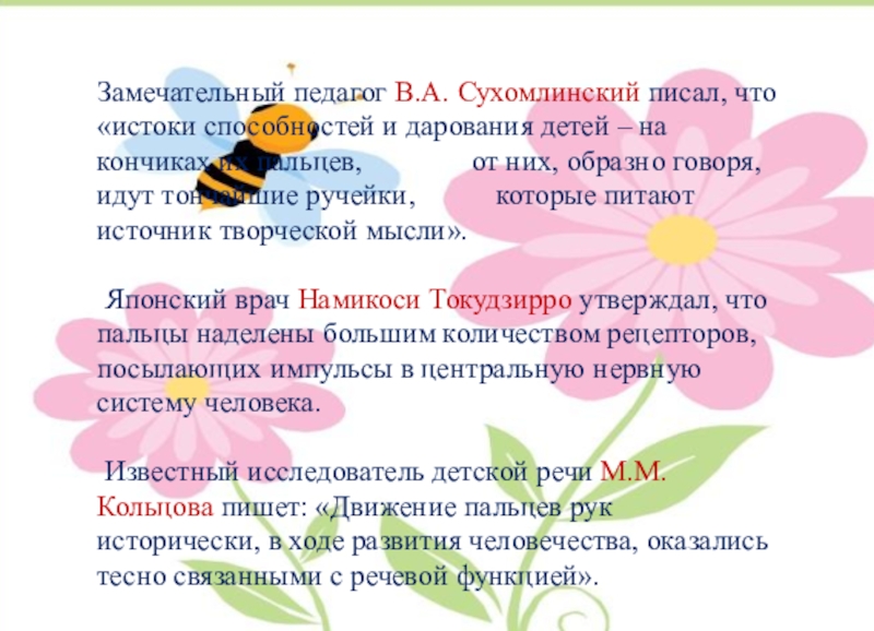 Известный исследователь детской речи М.М. Кольцова пишет: «Движение пальцев рук исторически, в ходе развития человечества, оказались тесно связанными с речевой функцией».
