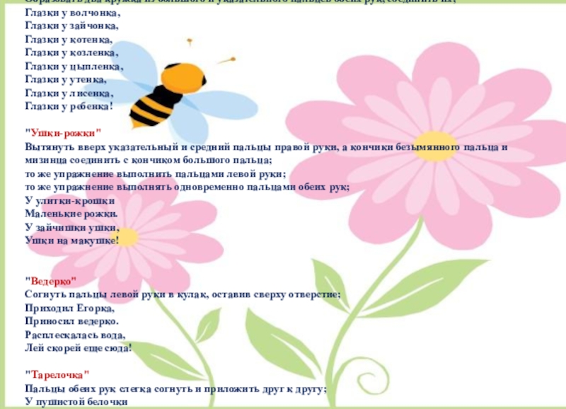 «Колечко» - поочередно перебирать пальцы рук, соединяя в кольцо с большим пальцем последовательно указательный, средний и т.д.