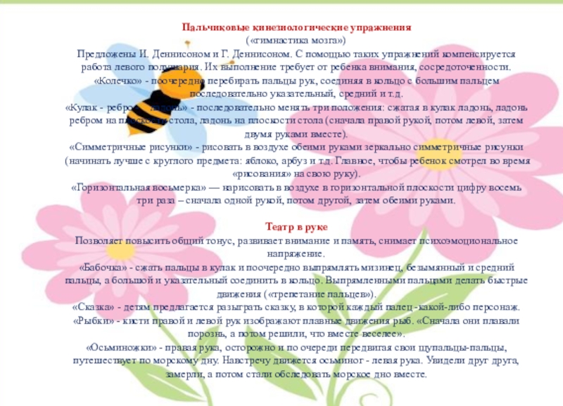 таких упражнений компенсируется работа левого полушария. Их выполнение требует от ребенка внимания, сосредоточенности.
