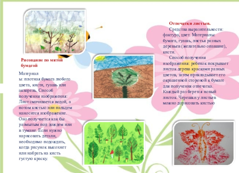 Способ получения изображения: ребенок покрывает листок дерева красками разных цветов, затем прикладывает его окрашенной стороной к бумаге для получения отпечатка. Каждый раз берется новый листок. Черешки у листьев можно дорисовать кистью
