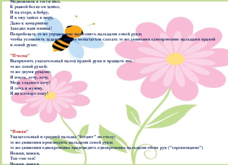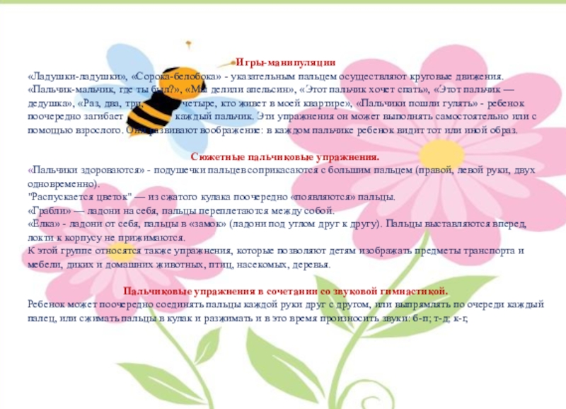 «Ладушки-ладушки», «Сорока-белобока» - указательным пальцем осуществляют круговые движения.