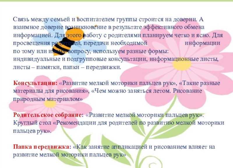 доверие возникновение в результате эффективного обмена информацией. Для этого работу с родителями планируем четко и ясно. Для просвещения родителей, передачи необходимой информации по тому или иному вопросу, используем разные формы: индивидуальные и подгрупповые консультации, информационные листы, листы – памятки, папки – передвижки.