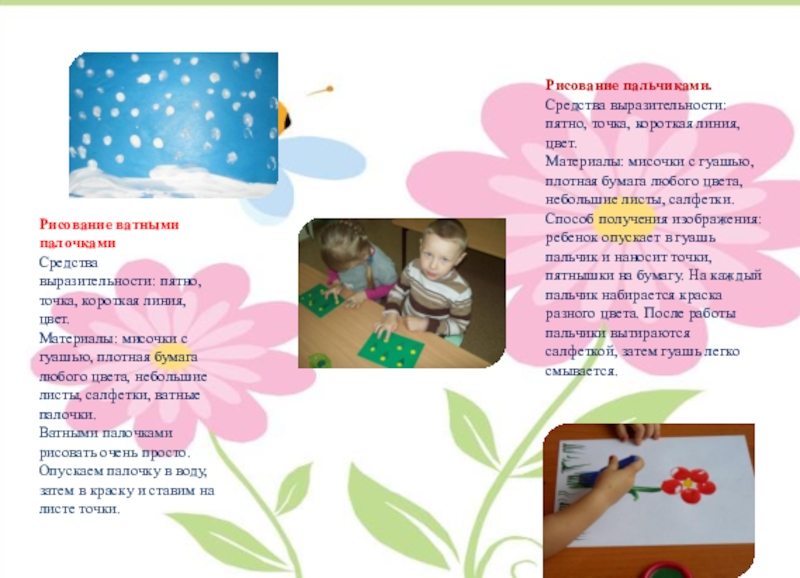 Способ получения изображения: ребенок опускает в гуашь пальчик и наносит точки, пятнышки на бумагу. На каждый пальчик набирается краска разного цвета. После работы пальчики вытираются салфеткой, затем гуашь легко смывается.
