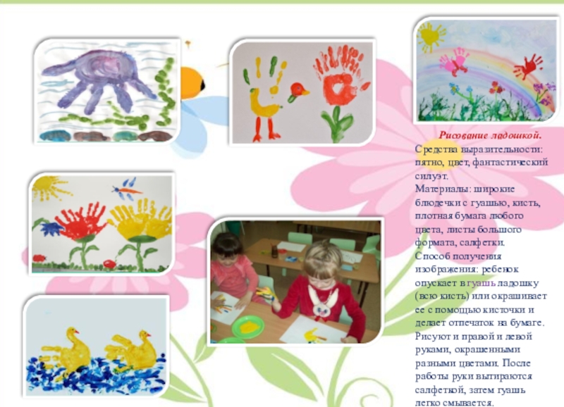 Способ получения изображения: ребенок опускает в гуашь ладошку (всю кисть) или окрашивает ее с помощью кисточки и делает отпечаток на бумаге. Рисуют и правой и левой руками, окрашенными разными цветами. После работы руки вытираются салфеткой, затем гуашь легко смывается.
