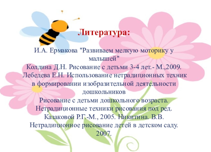Рисование с детьми дошкольного возраста. Нетрадиционные техники рисования под ред. Казаковой Р.Г.-М., 2005. Никитина. В.В. Нетрадиционное рисование детей в детском саду. 2007.