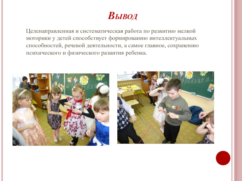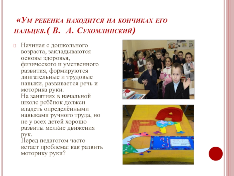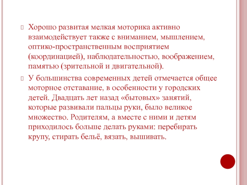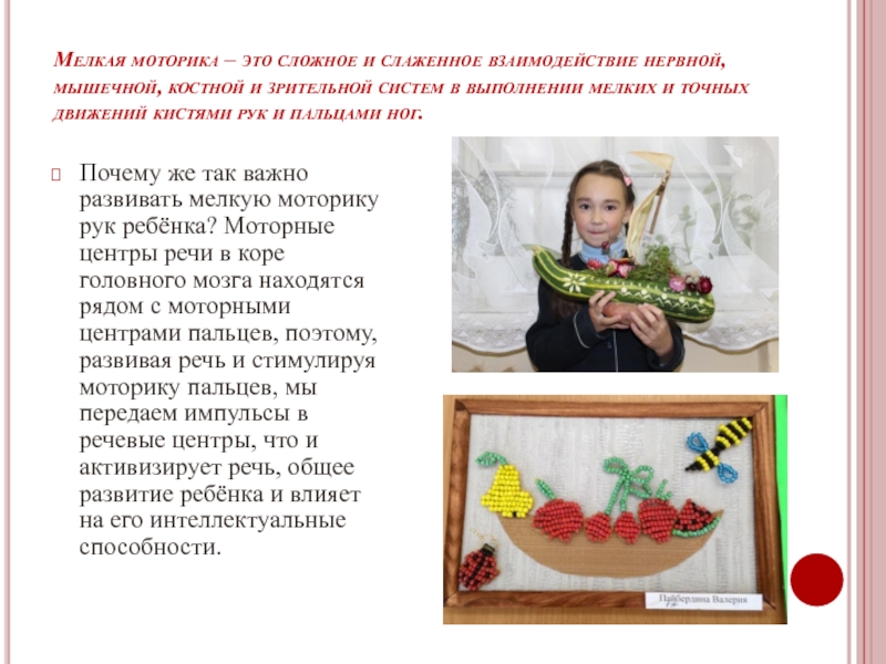 Почему же так важно развивать мелкую моторику рук ребёнка? Моторные центры речи в коре головного мозга находятся рядом с моторными центрами пальцев, поэтому, развивая речь и стимулируя моторику пальцев, мы передаем импульсы в речевые центры, что и активизирует речь, общее развитие ребёнка и влияет на его интеллектуальные способности.
