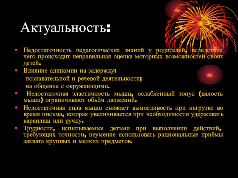 Недостаточность педагогических знаний у родителей, вследствие чего происходит неправильная оценка моторных