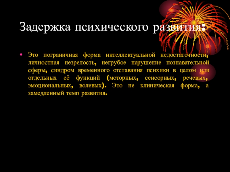познавательной сферы, синдром временного отставания психики в целом или отдельных её функций (моторных, сенсорных, речевых, эмоциональных, волевых). Это не клиническая форма, а замедленный темп развития.