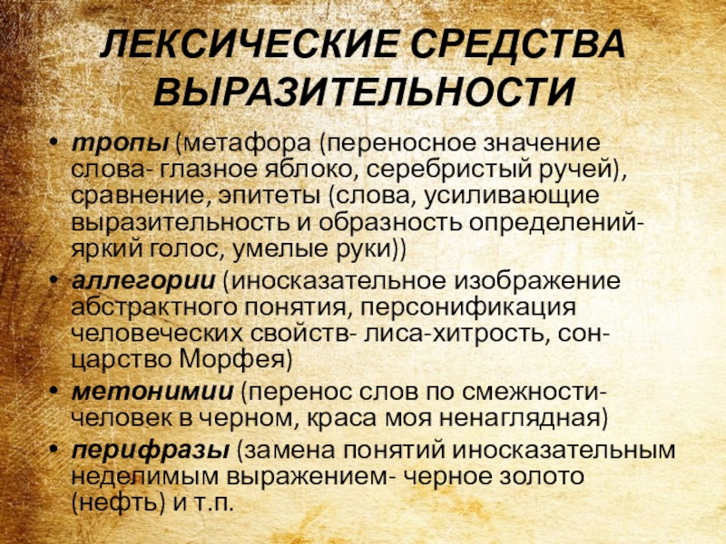 Слайд 11ЛЕКСИЧЕСКИЕ СРЕДСТВА ВЫРАЗИТЕЛЬНОСТИ