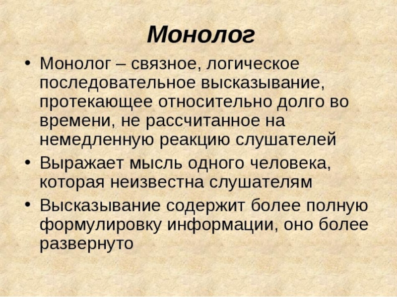 Монолог (Д1)- это форма связной речи (Н1). Он (Д2) представляет собой связное высказывание одного человека (Н2). Эта форма речи (Д3) протекает относительно долго по времени (Н3).