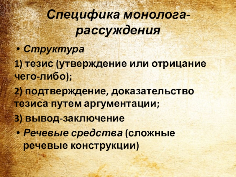 Слайд 15Специфика монолога-рассуждения