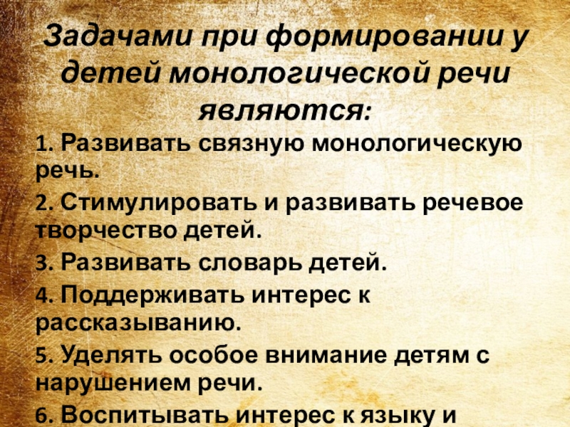 Слайд 16Задачами при формировании у детей монологической речи являются: