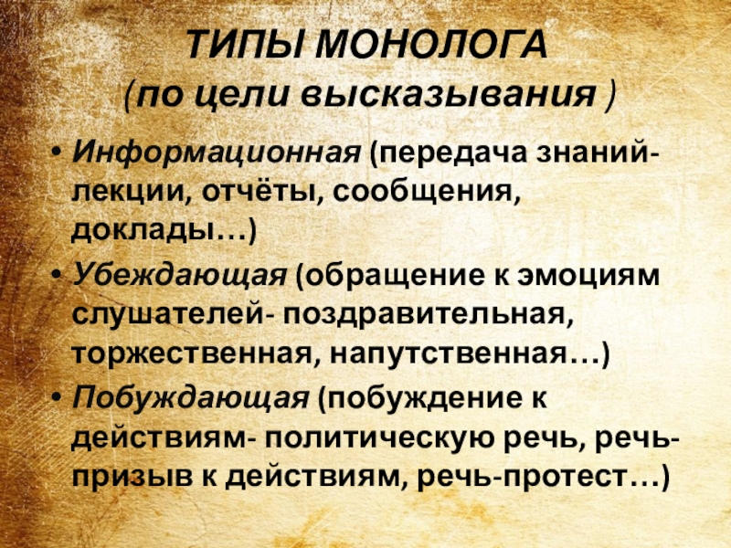 Слайд 8ТИПЫ МОНОЛОГА