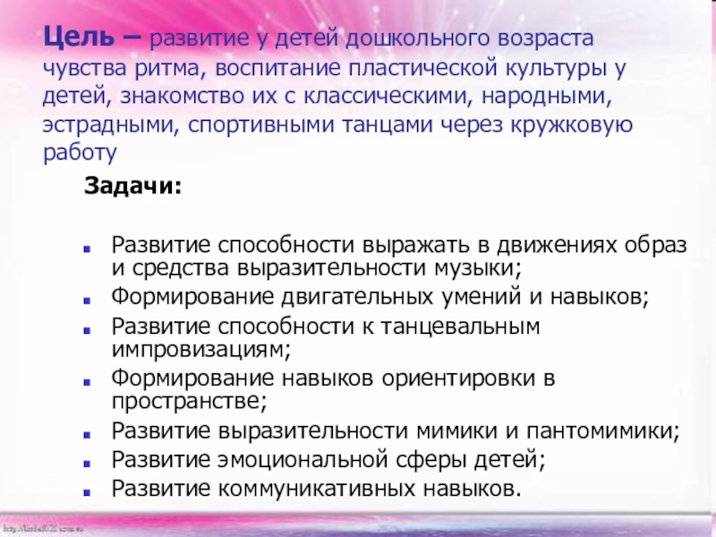 Развитие способности выражать в движениях образ и средства выразительности музыки;