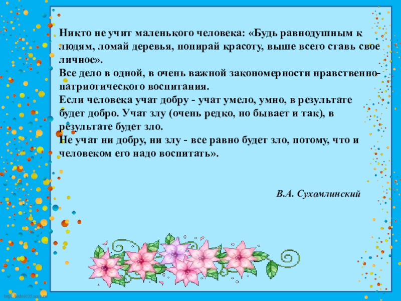Никто не учит маленького человека: «Будь равнодушным к людям, ломай деревья, попирай красоту, выше всего ставь свое личное». Все дело в одной, в очень важной закономерности нравственно-патриотического воспитания.            Если человека учат добру - учат умело, умно, в результате будет добро. Учат злу