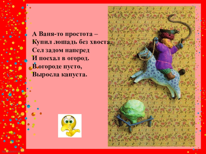 А Ваня-то простота – Купил лошадь без хвоста,Сел задом напередИ поехал в огород.В огороде пусто,Выросла капуста.