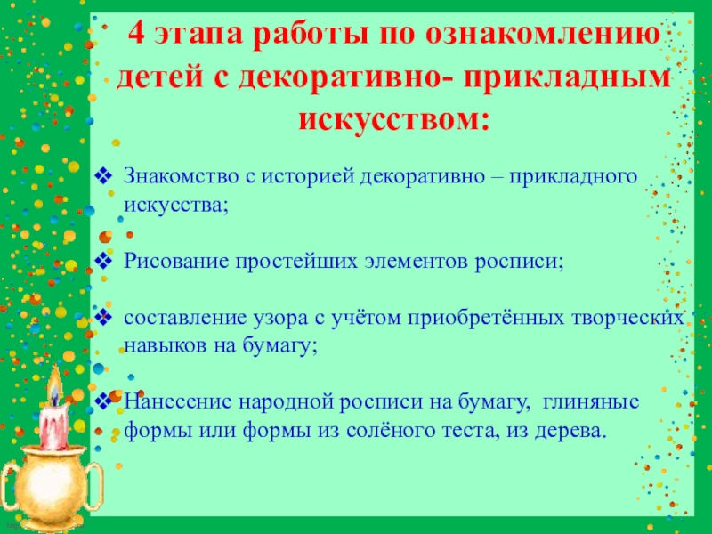 4 этапа работы по ознакомлению детей с декоративно- прикладным искусством:Знакомство с историей декоративно – прикладного искусства;Рисование простейших
