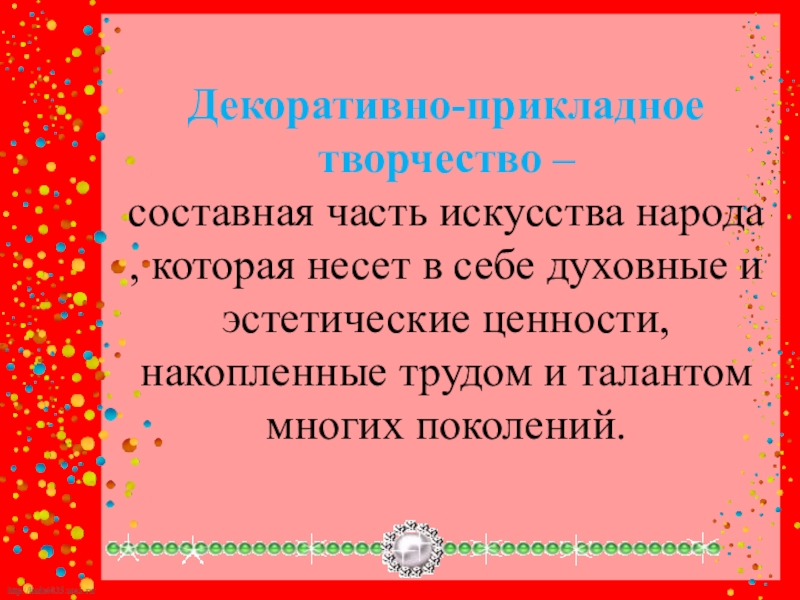 Декоративно-прикладное творчество – составная часть искусства народа , которая несет в себе духовные и эстетические ценности, накопленные