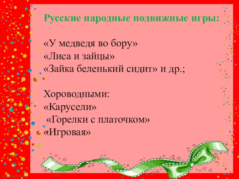 Русские народные подвижные игры: «У медведя во бору»«Лиса и зайцы»«Зайка беленький сидит» и др.; Хороводными: «Карусели» «Горелки