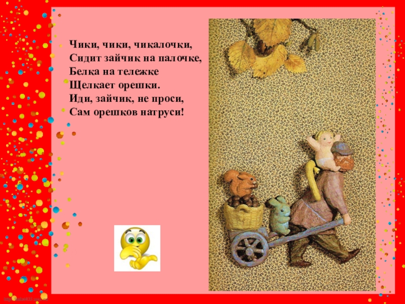 Чики, чики, чикалочки,Сидит зайчик на палочке,Белка на тележкеЩелкает орешки.Иди, зайчик, не проси, Сам орешков натруси!