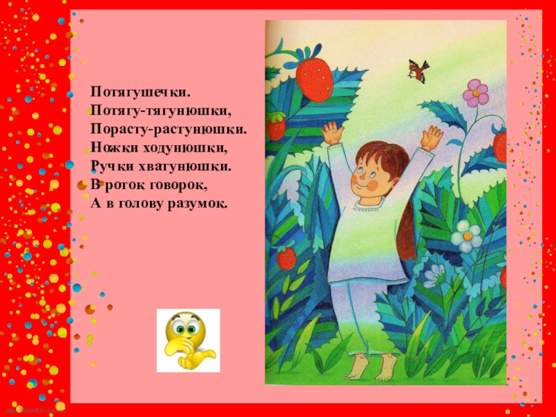 Потягушечки.Потягу-тягунюшки,Порасту-растунюшки.Ножки ходунюшки,Ручки хватунюшки.В роток говорок,А в голову разумок.