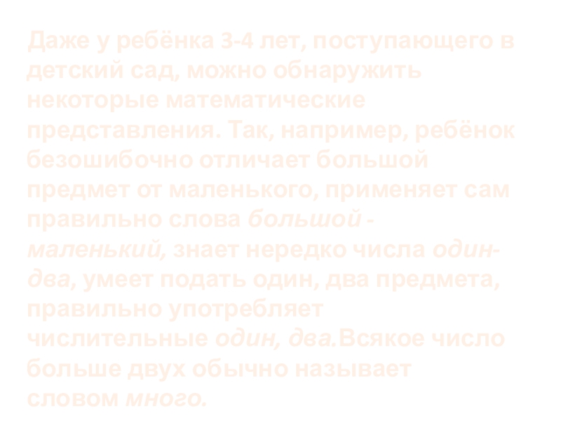 можно обнаружить некоторые математические представления. Так, например, ребёнок безошибочно отличает большой предмет от маленького, применяет сам правильно слова большой - маленький, знает нередко числа один-два, умеет подать один, два предмета, правильно употребляет числительные один, два.Всякое число больше двух обычно называет словом много.