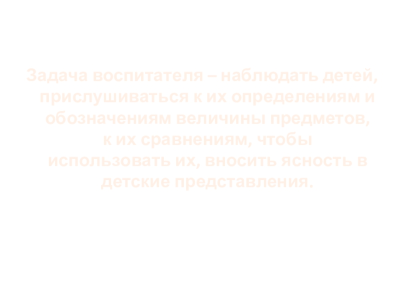 Задача воспитателя – наблюдать детей, прислушиваться к их определениям и обозначениям величины предметов, к их сравнениям, чтобы
