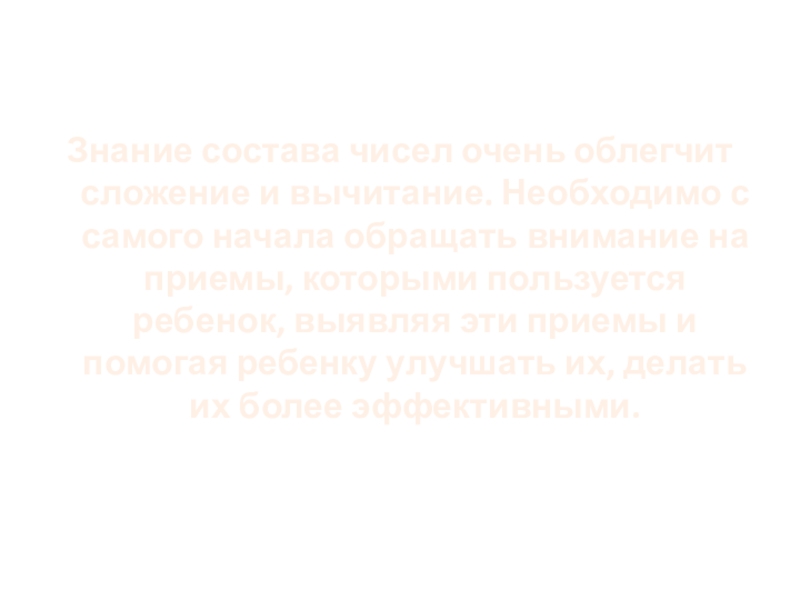 Знание состава чисел очень облегчит сложение и вычитание. Необходимо с самого начала обращать внимание на приемы, которыми