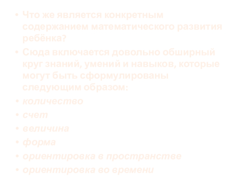 Слайд 4Что же является конкретным содержанием математического развития ребёнка?