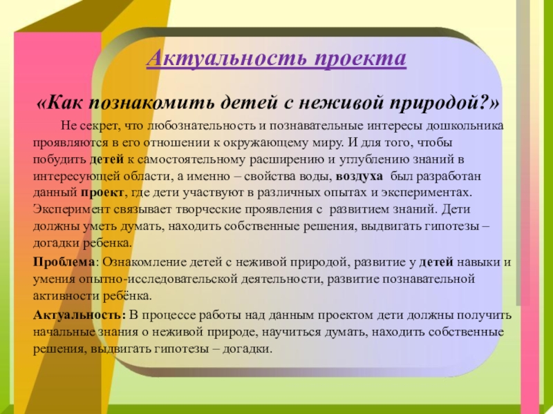 Актуальность: В процессе работы над данным проектом дети должны получить начальные знания о неживой природе, научиться думать, находить собственные решения, выдвигать гипотезы – догадки.