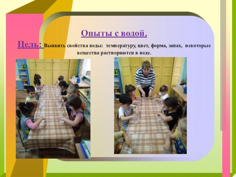 Цель: Выявить свойства воды: температуру, цвет, форма, запах, некоторые