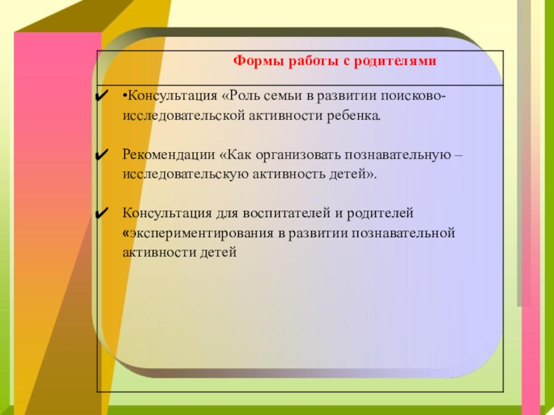 -Составить плана взаимодействия с родителями по развитию познавательно –исследовательской активности у детей 4-5 лет через опытно экспериментальную деятельность.