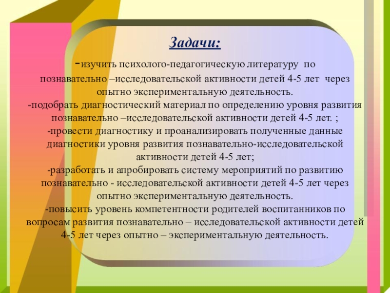 -разработать и апробировать систему мероприятий по развитию познавательно - исследовательской активности детей 4-5 лет через опытно экспериментальную деятельность.