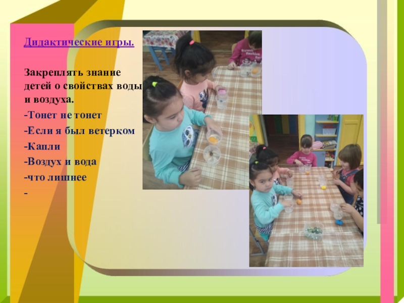 Изготовление дидактических игр, наглядного материала для знания детей о свойствах воздуха воды;