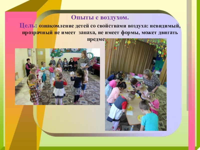 Цель: ознакомление детей со свойствами воздуха: невидимый, прозрачный не имеет